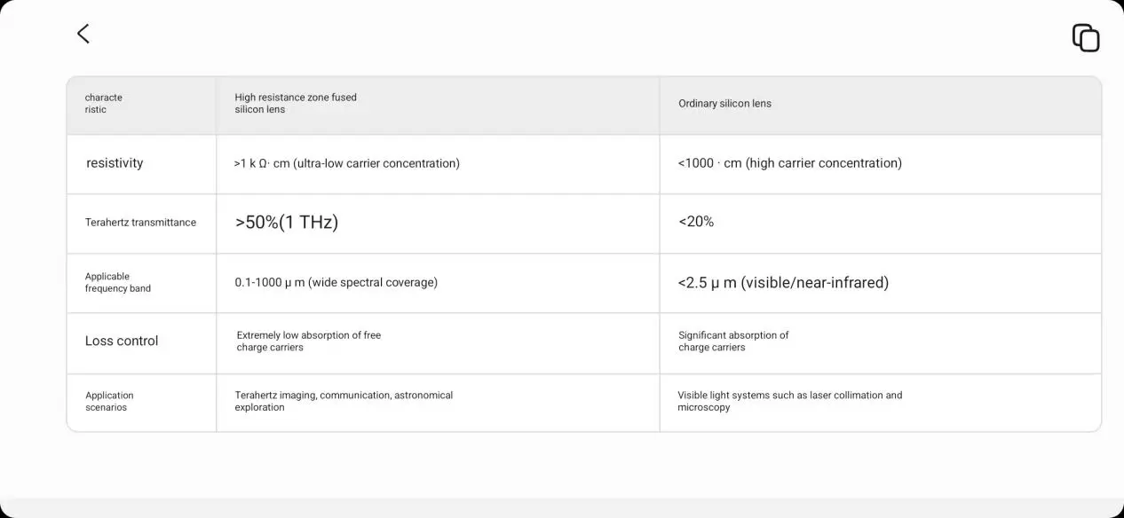 Hochohmiges Silizium wird durch Zonenschmelzen gereinigt, um Verunreinigungen zu reduzieren, während gewöhnliches Silizium (z. B. durch CZ-Wachstum) Sauerstoff- und Kohlenstoffverunreinigungen enthält, die die Verluste erhöhen; sein hoher spezifischer Widerstand unterdrückt direkt die Absorption von Terahertz-Wellen, während gewöhnliches Silizium aufgrund seiner hohen Ladungsträgerkonzentration einen starken Abfall der Transmission erfährt.
